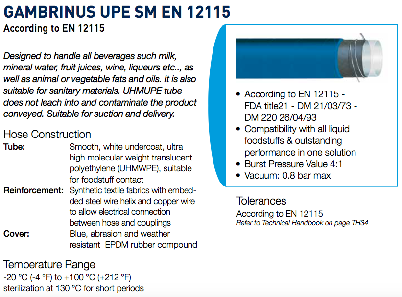 Home Produtos Óleo Hidráulica Mangueiras e acessórios Mangueiras Industriais Mangueiras para area alimentar GAMBRINUS UPE SM EN 12115 |